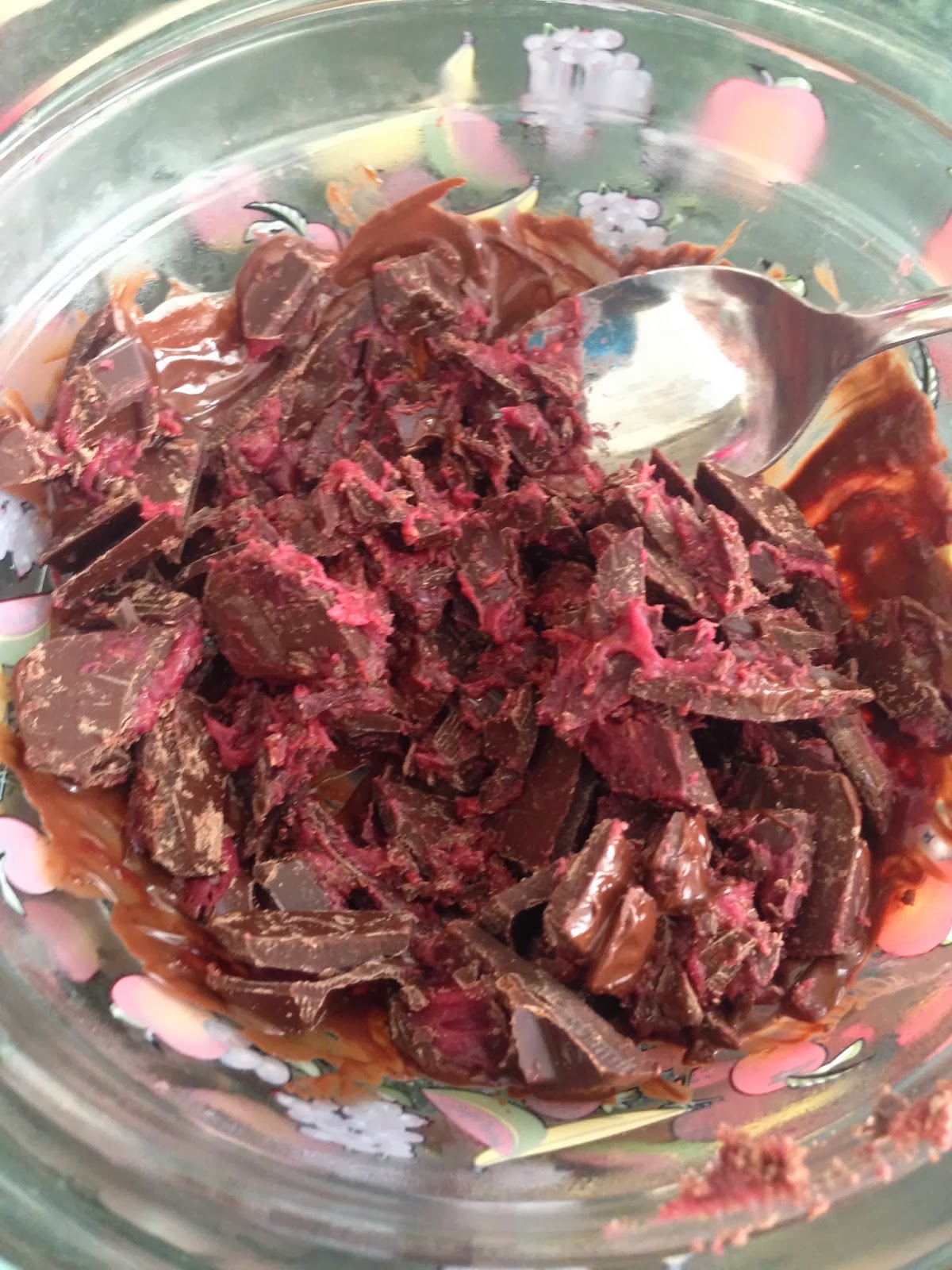 4. Here's where my troubles started. You are supposed to put hot boiling water in a large bowl, then the smaller bowl holding the chocolates into the hot water bowl, but the chocolates didn't melt enough. So I added a bit of that boiling water to the chocolate to get it to melt completely.